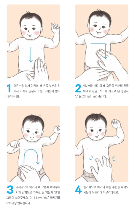 - 배 마사지 (I Love You 마사지) : 아기의 소화 운동 기능을 강화하고, 소화 흡수를 촉진하여 배앓이를 예방할 수 있습니다.